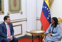 Venezuela’s interim president Delcy Rodriguez and Cederic Cremers, President of Built-in Gasoline at Shell plc, discuss throughout a gathering with […]