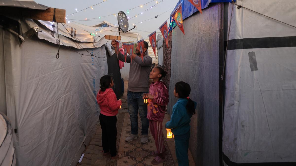 Younger displaced Palestinians maintain Ramadan lanterns as decorations are arrange subsequent to their tents on the Bureij refugee camp within the central Gaza Strip on February 15, 2026.