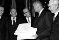 President Lyndon B. Johnson holds the signed doc of the Voting Rights Act of 1965 as he chats with Sen. […]