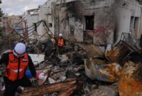 Israeli safety forces survey the location that was struck by an Iranian missile in Dimona, southern Israel on March 22, […]