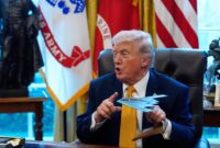 President Donald Trump holds a mannequin of a B-2 stealth bomber within the Oval Workplace of the White Home on […]