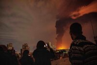 Residents look on and take photos as flames and smoke rise from an oil storage facility struck as assaults hit […]
