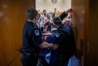 Brian McGinnis, a protester wearing a army uniform, will get caught in a door, injuring his arm, as U.S. Capitol […]