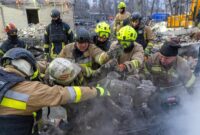 Rescuers clear the rubble as they seek for our bodies within the ruins of the residence constructing following Russia’s missile […]